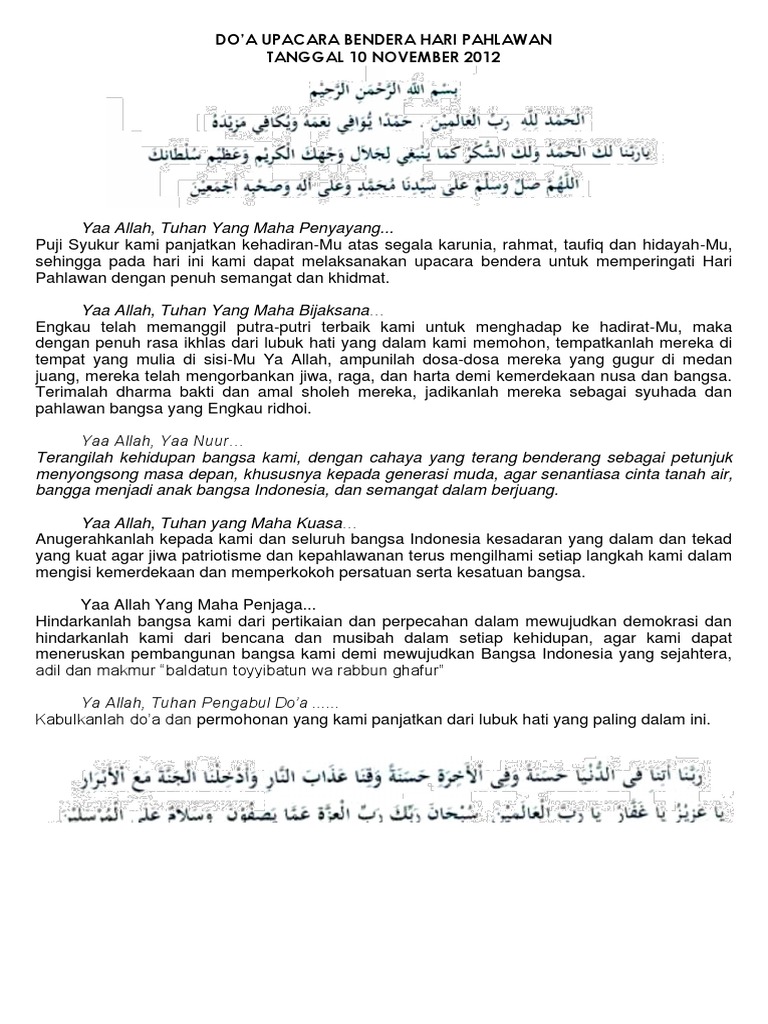 . Ya Allah Tuhan Yang Berkuasa Melaksanakan apa yang dikehendakki. Satu dari beberapa rangkaian pelaksanaan Upacara Bendera Hari Kemerdekaan RI yakni pembacaan doa. Beranda Kumpulan Doa.